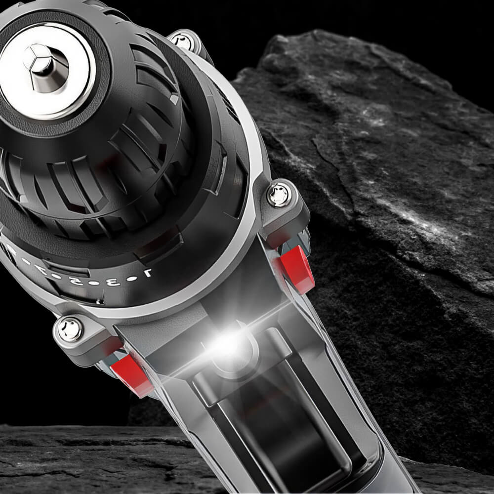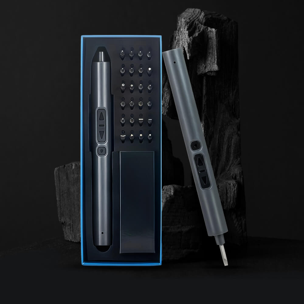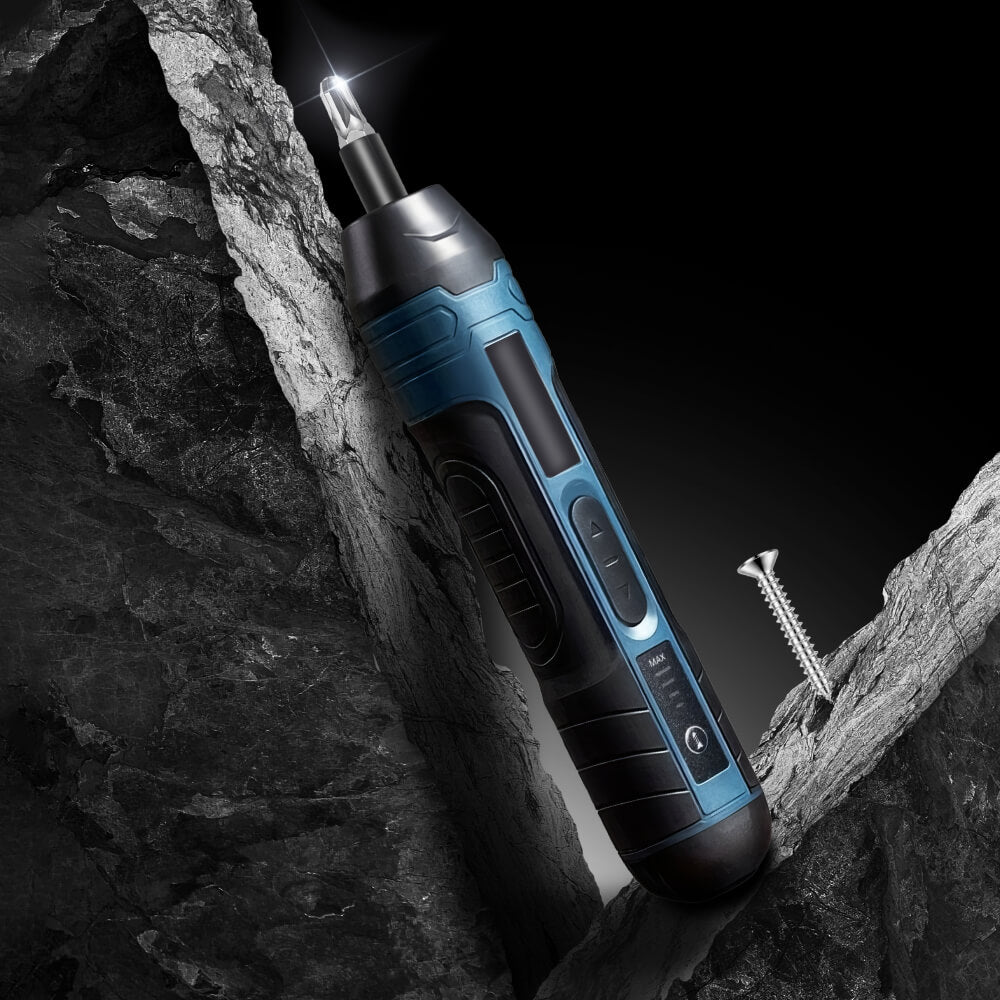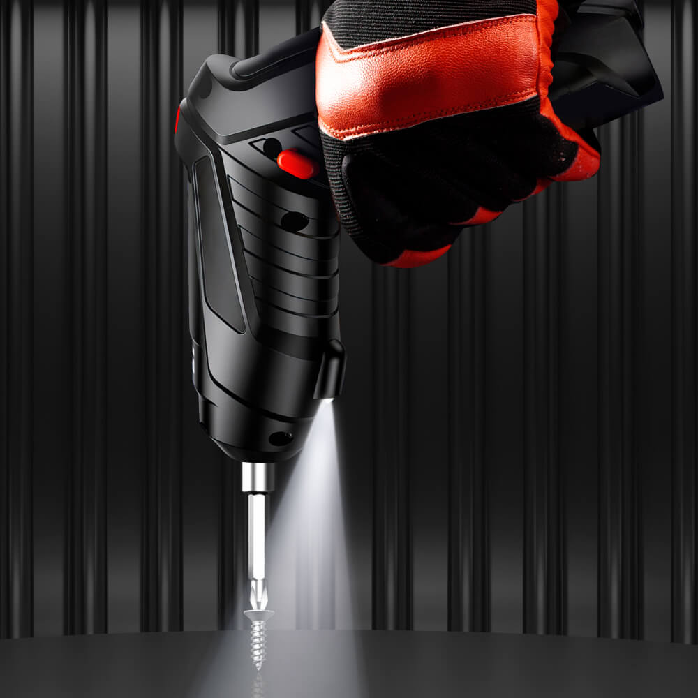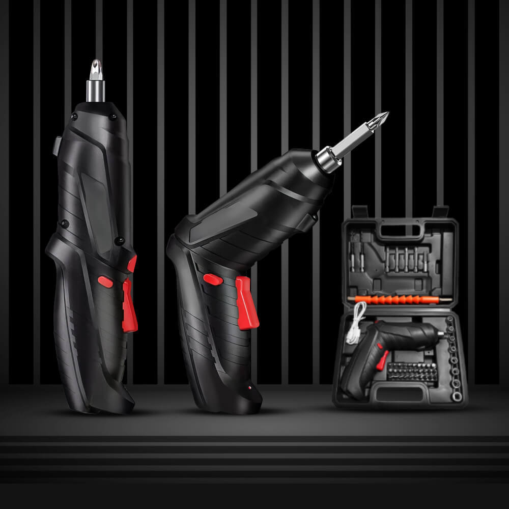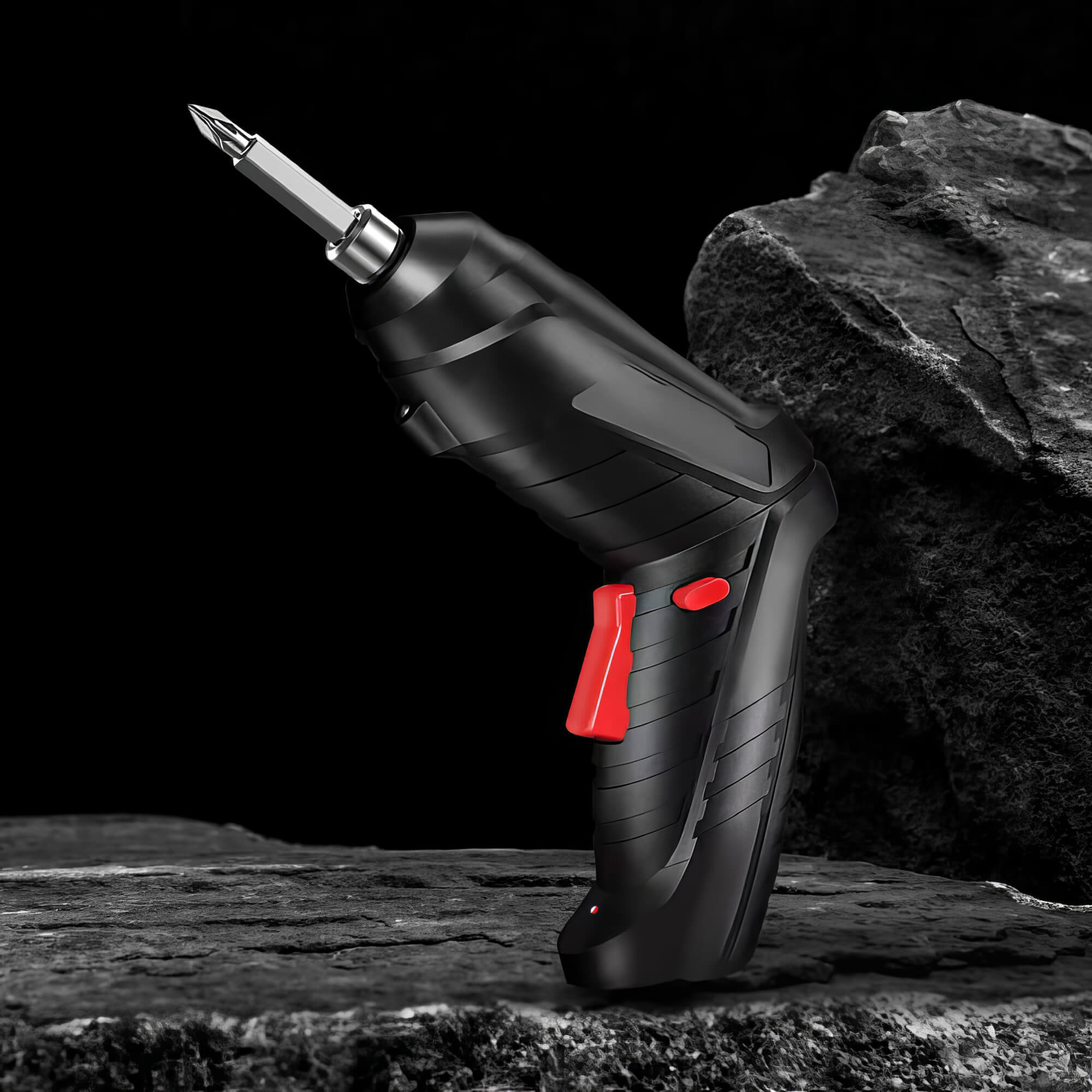 USB rechargeable cordless screwdriver with 4 torque levels (up to 5N.m) and 4-speed settings. Includes 105 attachments, built-in LED work light, and spindle lock for manual use. Compact and lightweight, suitable for home repairs, furniture assembly, and DIY projects.