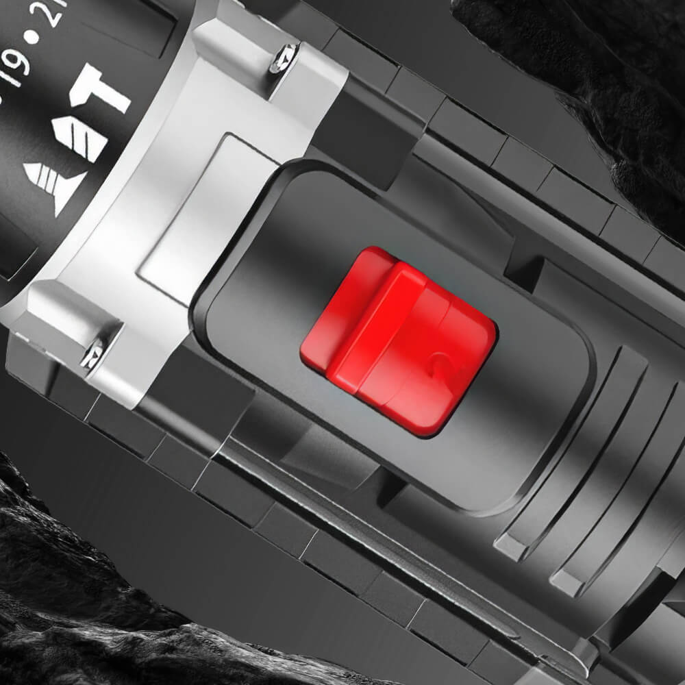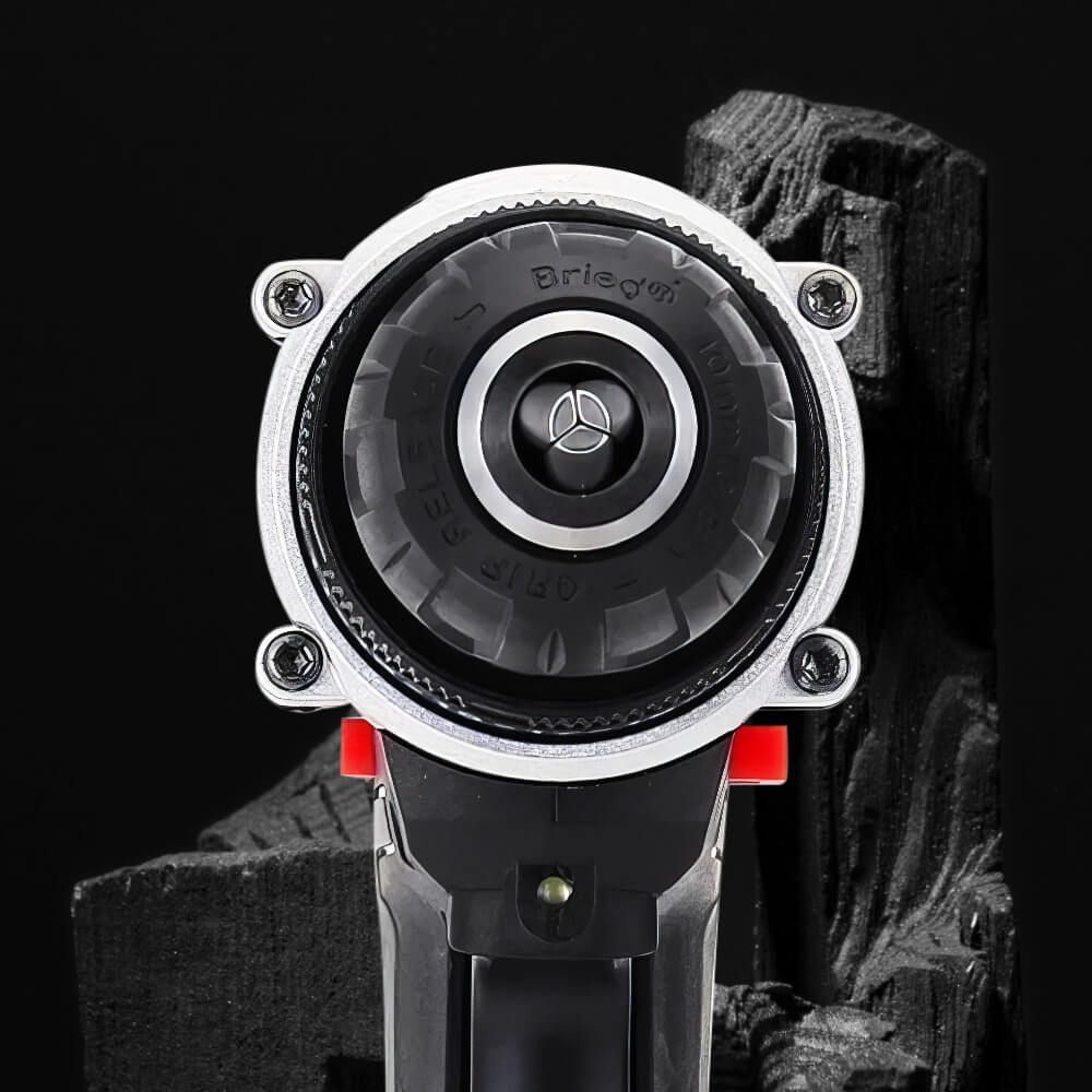 Two-position handle with LED light, three working modes (impact, lifting, flat drilling), flexible extension shaft for tight spaces, and 1500mAh rechargeable battery with up to 1-hour continuous use.